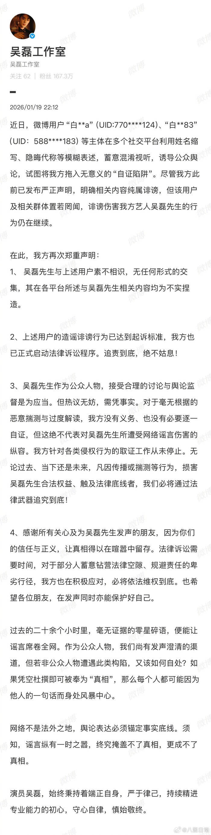 距离首条爆料仅68分钟线上炒股配资之家网,吴磊工作室于20时45分发布盖公章声明,以“恶意捏造”定性事件,明确表示已用区块链技术固定全平台证据,将以诽谤罪追责。更硬核的是,团队直接甩出《剑来》剧组通告单——2025年11月20日吴磊全天在浙江建德拍戏,IP属地与“澳门同游”谎言彻底对不上。次日吴磊本人更是十二字怒怼:“不认识,已委托律师依法追责”,工作室补充强调“双方素不相识、无任何交集”,拒绝陷入自证陷阱。